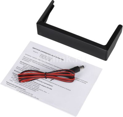 В комплекте имеется съёмный солнцезащитный козырек при работе на передней панели автомобиля, и также отрезок кабеля с вилкой питания типоразмера 5,5мм x 2,1мм, который может пригодиться при подключения монитора к бортовой электрической сети автомобиля:
