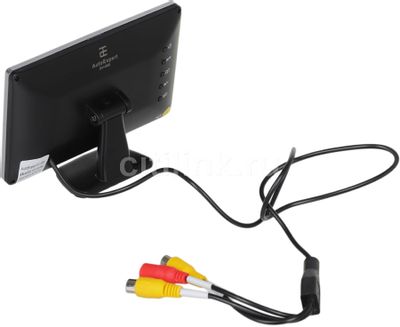 Управление монитором очень простое, и обеспечивается несколькими обычными кнопками без фиксации. Такой совершенно ненужной фишки для подобного рода изделия, как сенсорное управление, в мониторе нет. Видеовходов у монитора два равноценных — «CAM» и «Video». Оба они выполнены на основе стандартных RCA разъёмов, могут переключаться между собой вручную или автоматически. Гнездо питания монитора выносное, и выполнено на основе стандартного круглого разъёма типоразмера 5,5мм x 2,1мм, с «-» на обойме и «+» на центральном контакте. К этому гнезду успешно подходят штекеры многих стандартных 12V импульсных блоков питания. Монитор имеет отдельный провод для управления напряжением включения фонарей заднего хода автомобиля для того, чтобы в момент движения задним ходом автоматически включаться. Если этот провод не задействовать, то при наличии видеосигнала на RCA видеовходе монитора под названием»Video», и при подаче электропитания на его круглый разъём 5,5мм x 2,1мм изображение на экране устройства появляется автоматически. При этом не требуется никаких манипуляций по включению монитора верхней кнопкой его кнопочной станции, выбора нужного видеовхода и прочих.
