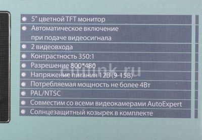 Жидко-кристаллический компактный монитор AutoExpert DV-550 имеет размеры диагонали экрана 5», и экономичную светодиодную подсветку экрана LED. Это ровно такая же диагональ экрана, как и у экрана обычного смартфона. Предназначен такой монитор в основном для использования в автомобиле, где он устанавливается на переднюю панель, или в иное подходящее место. Однако такой монитор с успехом может быть использован и в бытовых условиях, вне автомобиля. Для этого его потребуется запитать от отдельного блока питания напряжением 12 вольт, и с расчётом того факта, что монитор имеет заявленный потребляемый ток около 0,35A.