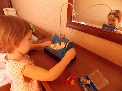 Мой средненький удивил меня- ему так понравилась машинка, что он шьет на ней каждый день. Уже сам(!!!) сшил своему мишутке подушечку и машинку. Заодно учится гладить ткани перед работой и пришивать пуговицы.