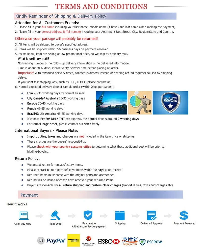 Delivery Time: Order amount over 100usd, will be sent by Fedex. It usually takes 7-15 days to most countries. Otherwise,it will be sent by registered mail, and it usually takes 15-45 days to most countries.