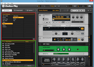Дальше скачиваем программу (Можно скачать тут), и запускаем. Guitar Rig весьма легок в использовании(но не в настройке). В красном окне выбираете стиль звучания (Рок, метал, блюз, джаз, поп и т.д.). В зеленом окне — уже отдельный тип настройки звука. В названии не нетрудно угадать чью настройку копирует данный файл. (Ram Ones — RamOnes, Little Jimis Wing — Джимми Хендрикс). В программе встроено много эффектов не только по исполнителям, но и по просто звучанию (Советую попробовать Ya-Ya-Ya guitar во вкладке Effects). Кроме встроенных в интернете можно найти множество других, сделанных уже более точно, для отдельной песни, или даже для отдельной части песни определенного гитариста. Настройки как правило называют пресеты(preset). Вводите название песни, добавляете пресет и выбираете любой