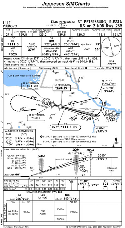 Ниже приведён для примера карты Jeppesen Approach (хотя есть и другие виды карт) для захода на посадку в аэропорте Пулково. Подход на 28 правую полосу.