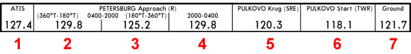 1. Частота ATIS (Automatic Terminal Information Service) — служба (система) автоматического вещания. Содержит данные о фактической погоде в районе аэродрома, рабочих ВПП, схем захода и другую информацию, важную для экипажей ВС, содержащуюся в NOTAM. В приведённом случае это 127.4 Мгц. В России еще называется службой «Метео».