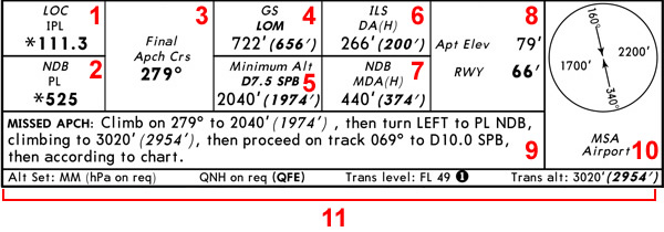 3. Просто какой-то комикс (рассказ в картинках) про уход на второй круг. Читается комикс так: если Missed approach, то набираем высоту 2040 футов, двигаясь при этом курсом 279. Потом делаем поворот влево на NDB PL (частота 525), для тех, кто по стрелке не может определить где право, а где лево, написано: «LT» — Left Turn. По достижении PL, набираем высоту 3020 футов.