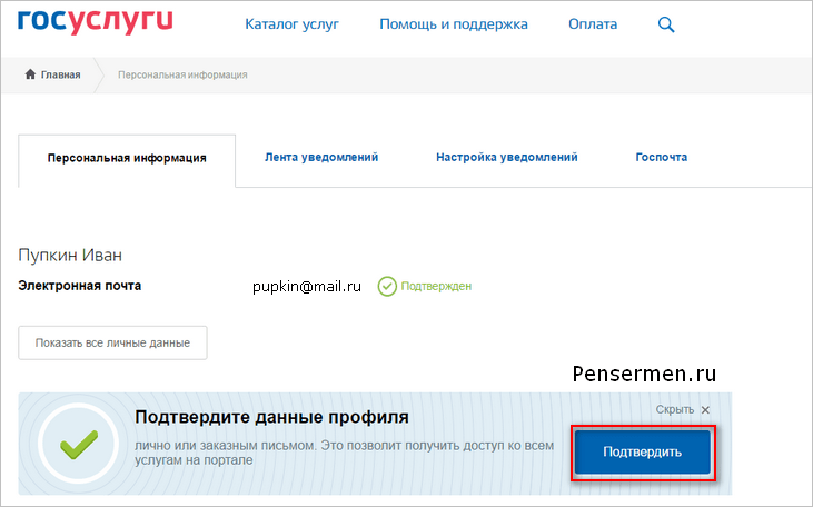 После этого откроется страница с Вашими персональными данными, только добавиться ещё одно информационное окно. Несколько ниже оно изображено На этом инструкция по основным нашим действиям на сайте госуслуг можно считать законченной. Остаётся дождаться письма. Обычно извещение на получение заказного письма приходит не позднее чем через две недели после подтверждения личности на сайте.