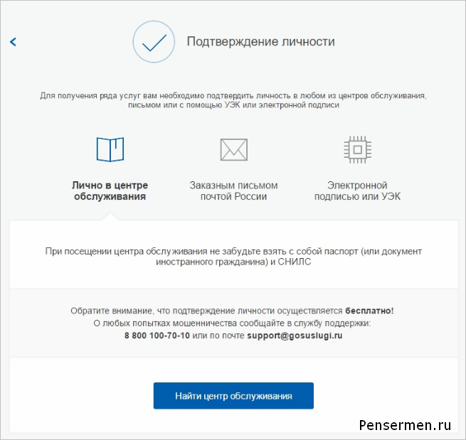 Последним шагом необходимо подтвердить свою личность. Самый простой способ — посетить ближайший центр обслуживания, в котором специалисты закончат вашу регистрацию. Жмем кнопку «Найти ближайший центр обслуживания» и выбираем любое из предложенных мест в котором осуществляется услуга по подтверждению личности.