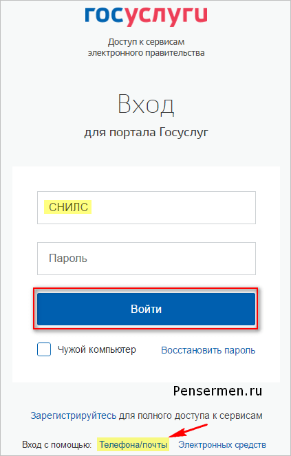 Итак, входим в свой личный кабинет. Кстати бывает так, что открывается окно и там где Вы вводили номер телефона или электронную почту вдруг появляется надпись «СНИЛС». Иногда люди теряются, но ничего страшного здесь нет. Просто внизу, в строчке «Вход с помощью:» нажмите на ссылку «Телефона/почты» и всё встанет на свои места: