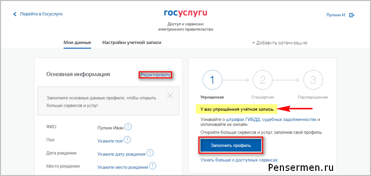 Вошли. Видим свои личные данные, нажимаем «»Редактировать»», если есть необходимость, редактируем и сохраняем. Или же сразу нажимаем «Заполнить профиль»: