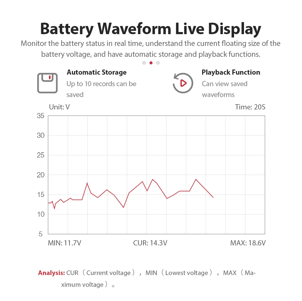 Отслеживайте состояние аккумулятора в режиме реального времени, узнайте текущий плавающий Размер напряжения аккумулятора и имейте функции автоматического хранения и воспроизведения.