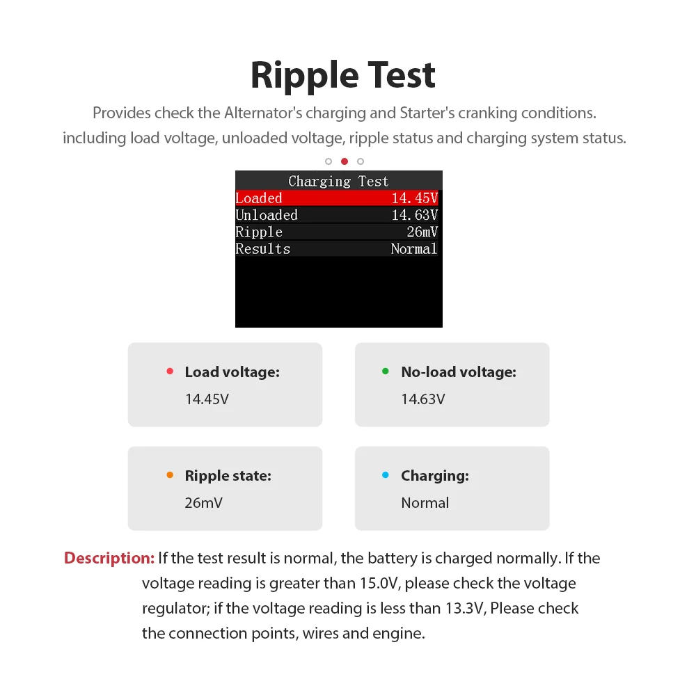 Проверьте систему зарядки двигателя, чем меньше колебание формы волны, тем стабильнее напряжение, указывая на то, что аккумулятор в хорошем состоянии.