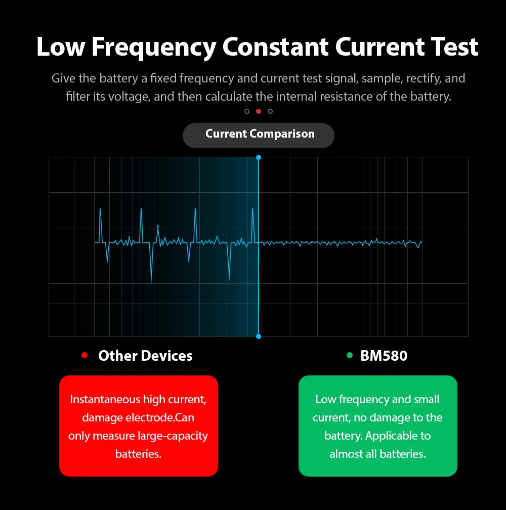 BM580 с цветным TFT-экраном 2,4 дюйма, который в основном предназначен для анализа состояния батареи для расчета фактического холодного запуска, емкости батареи и степени старения, которые предоставляют надежные аналитические доказательства для тестирования и обслуживания батареи.