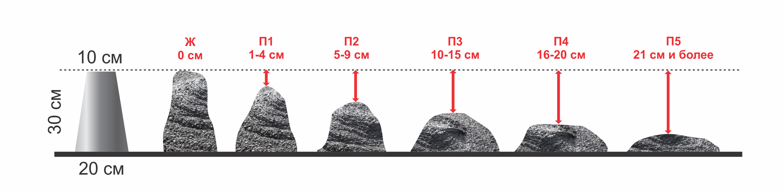 Исходя из предыдущего пункта, можно определить, что усадка конуса бетона – это цифровое значение в сантиметрах, насколько опустился бетон после снятия формы конуса. Данный показатель даёт возможность классифицировать бетон по пластичности внутри классификационной группы. То есть, при усадке более 5 см, мы уже определяем смесь как высокоподвижную, но зная значение осадки конуса в 10-15 см, можно сделать вывод, что она относится к группе П-3.