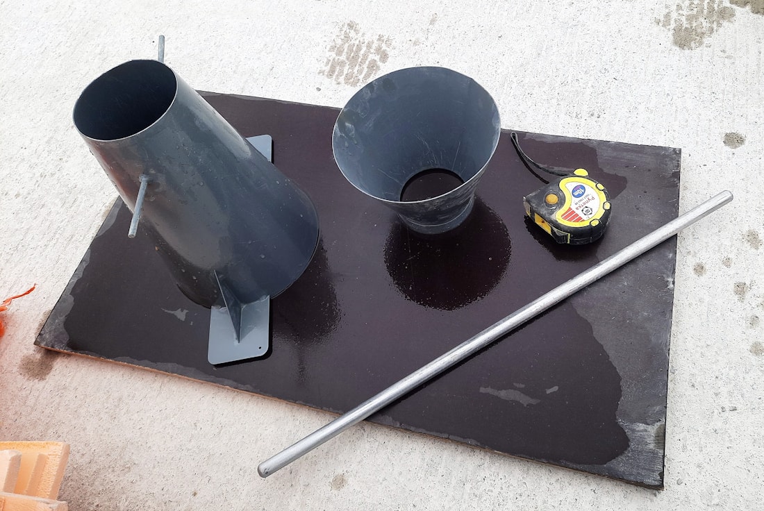 Изготавливая бетон в домашних условиях, можно обойтись и без стального листа, и без прутка. На самом деле они не влияют на величину осадки конуса. Устройство можно ставить на любую ровную поверхность, будь то лист ДВП, оргалита или фанеры, а для штыкования подойдёт любой металлический прут, например, кусок арматуры.