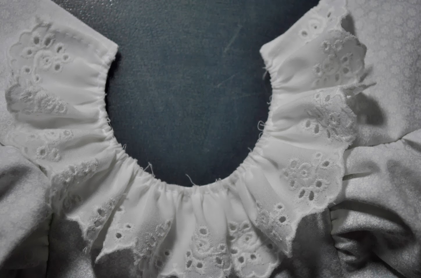 6. По нарисованной горловине прикладываем кружево, оставляя «хвостики» по 30 см — на завязки.