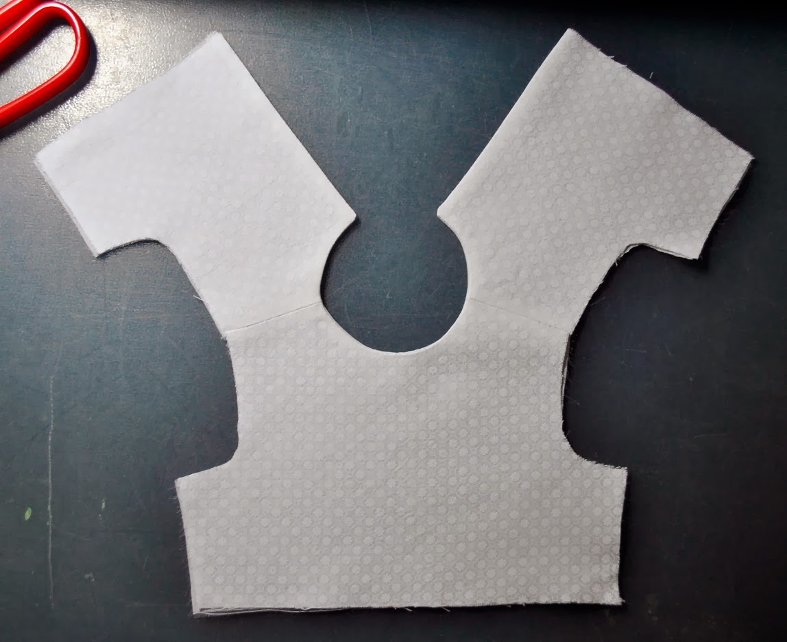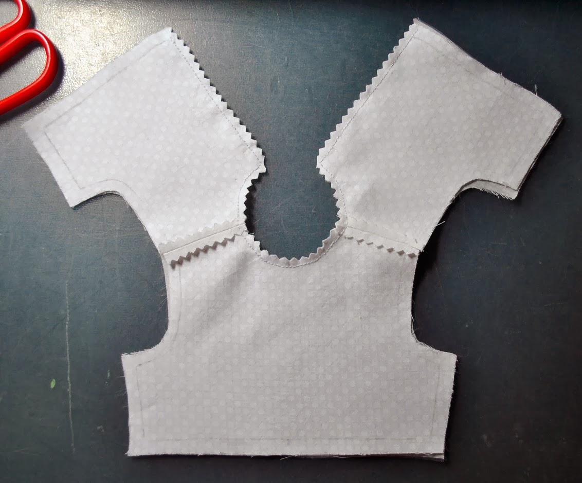 3. Складываем спинку вдоль пополам, рисуем каплю-вырез,вырезаем и прокладываем строчку. По шву горловины и вырезу делаем надсечки, либо можно использовать ножницы-зигзаг. Я их очень люблю, так как наш подклад с изнанки просвечивает, шов зигзагом будет «светиться» аккуратнее, чем рассечки. Но здесь нужна осторожность, так как ткань рыхлая, а ножницы грубые. Срезать шов нужно осторожно, не доходя до строчки 3 мм. Иначе при выворачивании наш шов вылезет на лицо.