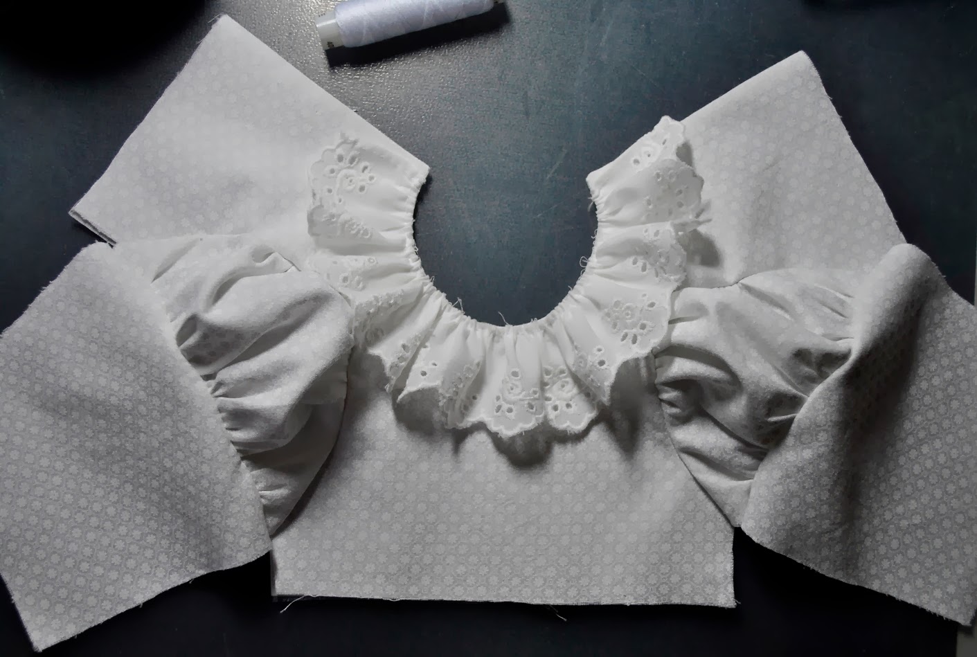 - Втачиваем крылышки со стороны рукава, подталкивая под лапку сборку и расправляя ее дополнительно иголочкой. Убираем нитки вметывания.