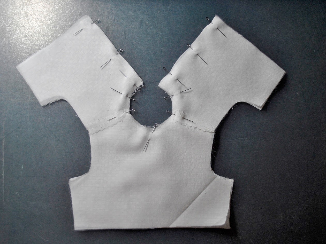 Сложите верх и подкладку лицевыми сторонами внутрь и сколите булавками по горловине и по спинке. Плечевые швы должны быть разглажены.