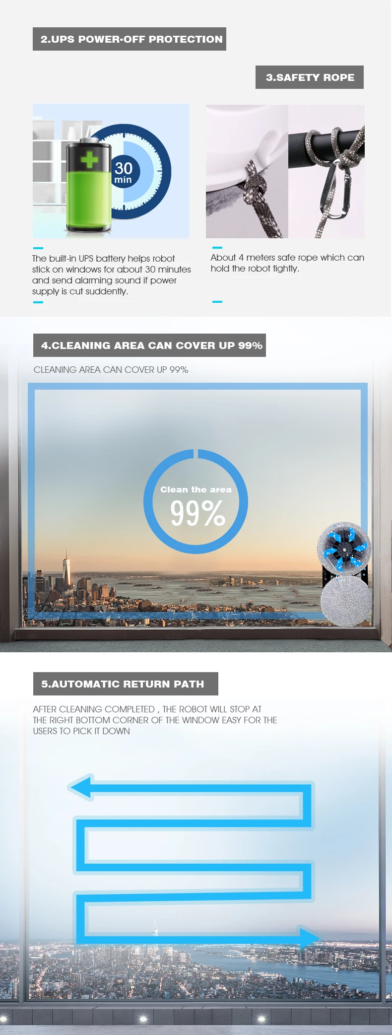 При случае отключения электричества, робот-мойщик подаст звуковой сигнал и останется зафиксированным на поверхности в течение 20 минут, за которые нужно успеть отлепить от стекла.