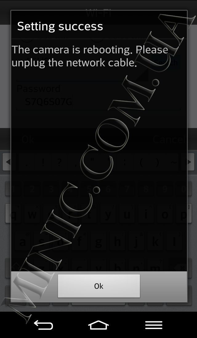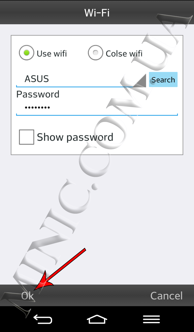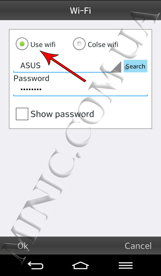 Выберите пункт «Wi-Fi» и нажмите на кнопку «Use wifi». В появившемся окне введите название и пароль Вашей беспроводной сети. Нажмите «Ok» и подождите 10 секунд.