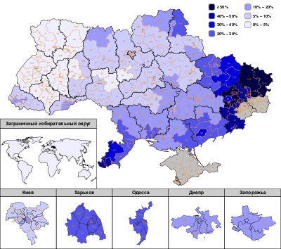 In the October 2020 Ukrainian local elections Opposition Platform – For Life took third place with 11.75% of all votes being cast to the party.[46] (The highest number of seats in the election was won by Servant of the People with 17.59% of local deputies nominated in the election by this party.[46] Second place was for Fatherland with 12.39%.[46]) The party was successful in South and Eastern Ukraine, although the local parties of city mayors (in particular in Odesa, Mykolaiv and Sloviansk) cost them support compared with its predecessor Opposition Bloc in the 2015 Ukrainian local elections.[47][48] Oleksandr Popov, former head of the Kyiv City State Administration, was a candidate for Mayor of Kyiv nominated by OPFL.[49][50] In the election he received 68,757 votes, securing second place but losing the election to incumbent Mayor Vitali Klitschko.[51] Konstantyn Pavlov [de; uk; ru] from the OPFL won the election for mayor of Kryvyi Rih.[52][53]