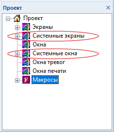 - две новые ветки в дереве проекта — Системные окна и Системные экраны