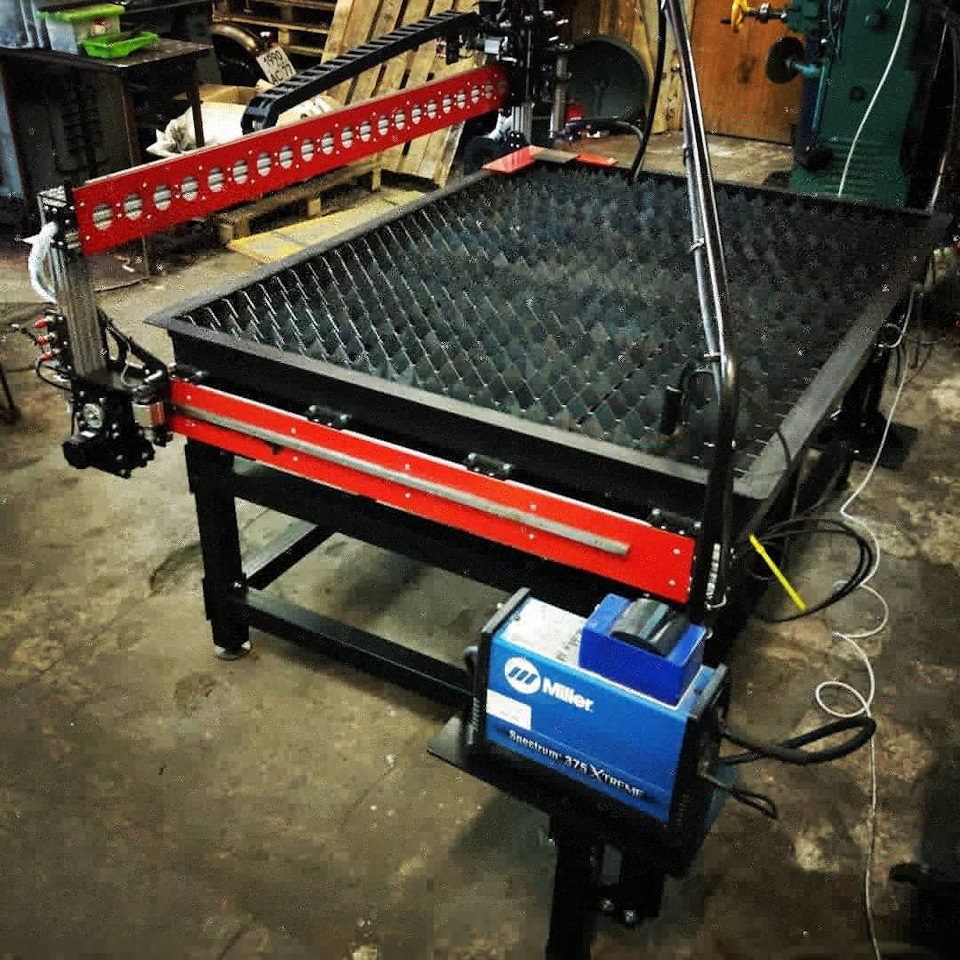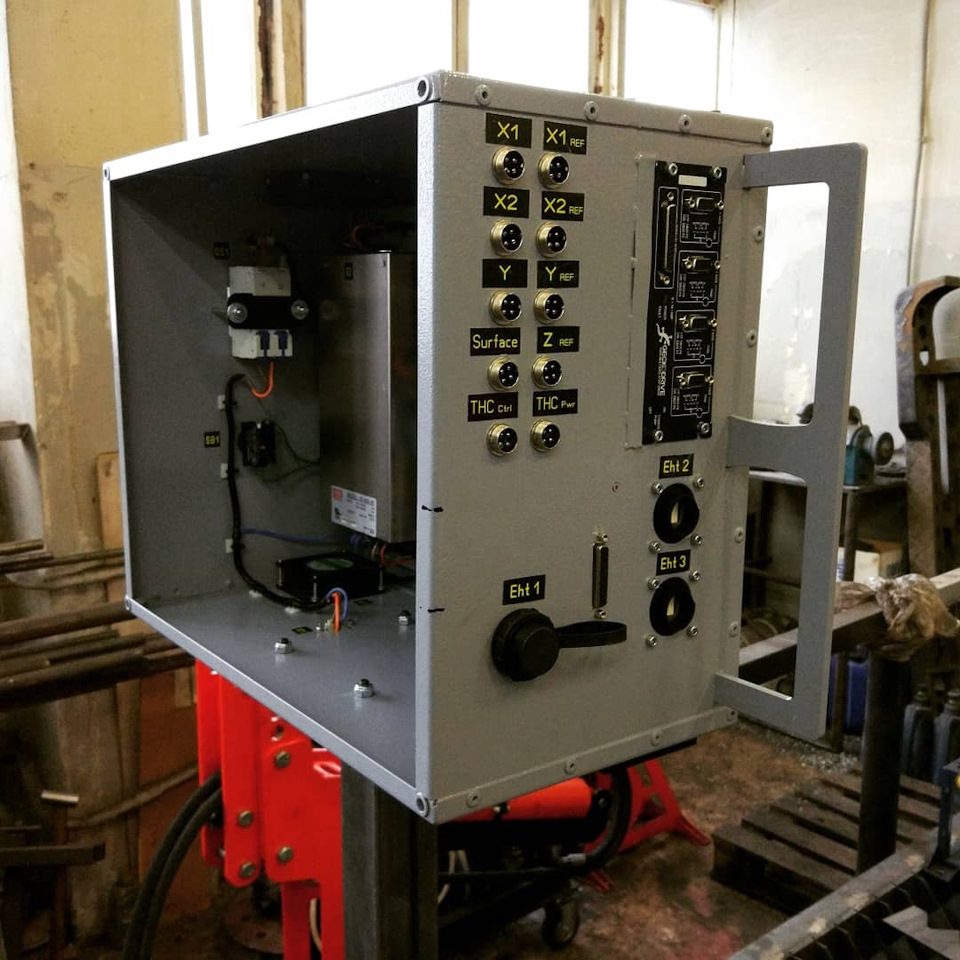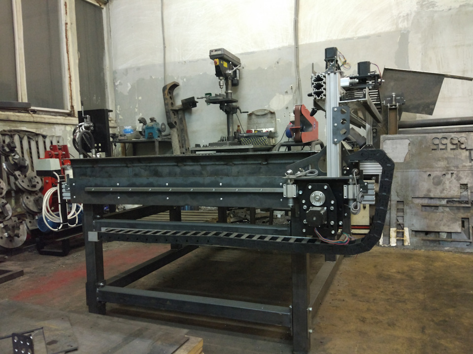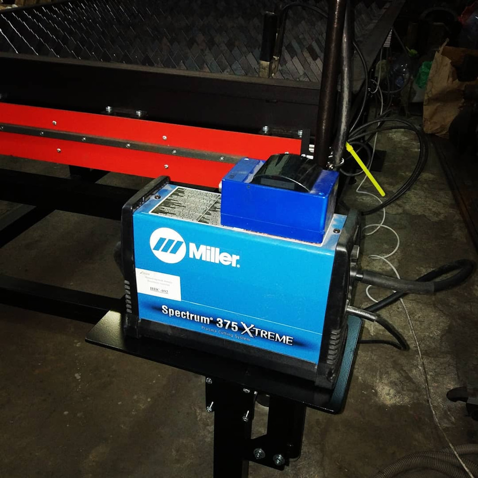 Наш давний клиент воодушевился нашим опытом постройки и эксплуатации станка плазменной резки и попросил собрать похожую машину для своих нужд. Требуемые характеристики были такие: рабочее поле 1500х1000мм, водоналивной стол, привод — шаговые двигатели с редукторами 1:3. Система управления — Pumotix, отлично зарекомендовавшая себя на других наших проектах. Аппарат плазменной резки заказчик предоставил сам — редкий в наших краях Miller Spectrum 375 X-treme. Аппарат всего на 30А, т.е. максимально возможная толщина, которую можно будет резать с комфортной скоростью будет не больше 6мм, но других задач и не стоит. Зато он отличается исключительной надежностью. Все-таки, это Miller, а не какая-нибудь китайщина.