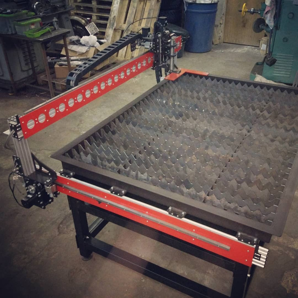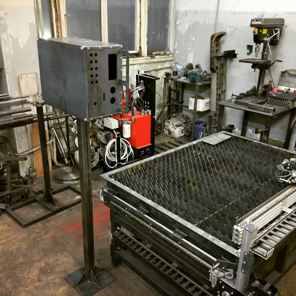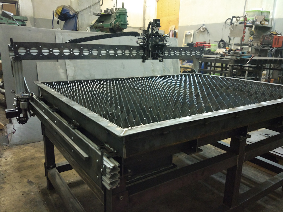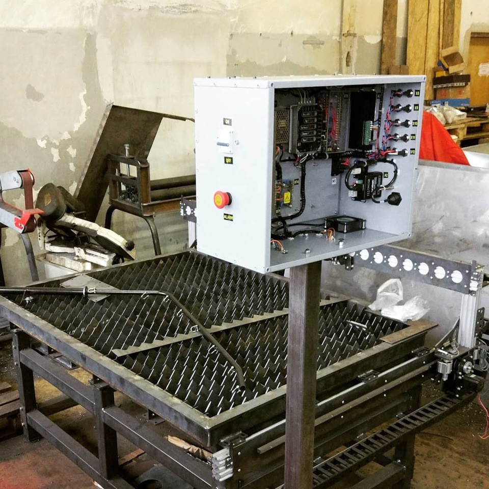 Наш давний клиент воодушевился нашим опытом постройки и эксплуатации станка плазменной резки и попросил собрать похожую машину для своих нужд. Требуемые характеристики были такие: рабочее поле 1500х1000мм, водоналивной стол, привод — шаговые двигатели с редукторами 1:3. Система управления — Pumotix, отлично зарекомендовавшая себя на других наших проектах. Аппарат плазменной резки заказчик предоставил сам — редкий в наших краях Miller Spectrum 375 X-treme. Аппарат всего на 30А, т.е. максимально возможная толщина, которую можно будет резать с комфортной скоростью будет не больше 6мм, но других задач и не стоит. Зато он отличается исключительной надежностью. Все-таки, это Miller, а не какая-нибудь китайщина.