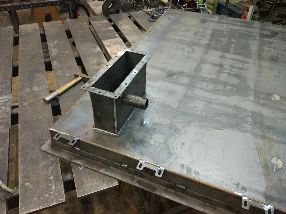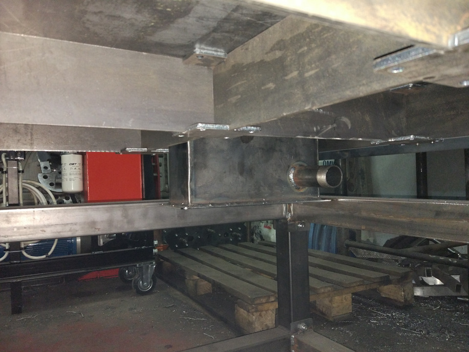Верхняя часть неразборная, опоры крепятся на болтах. Поверх станины крепится поддон для воды, который будет собирать шлам. У водяного поддона есть свои минусы (его гораздо сложнее чистить после окончания рабочей смены), но зато гораздо скромнее требования к вентиляции, т.к. основная масса продуктов горения металла остается в воде и не загрязняет воздух.