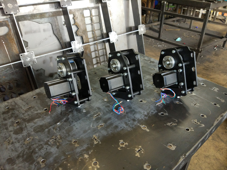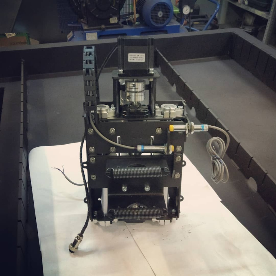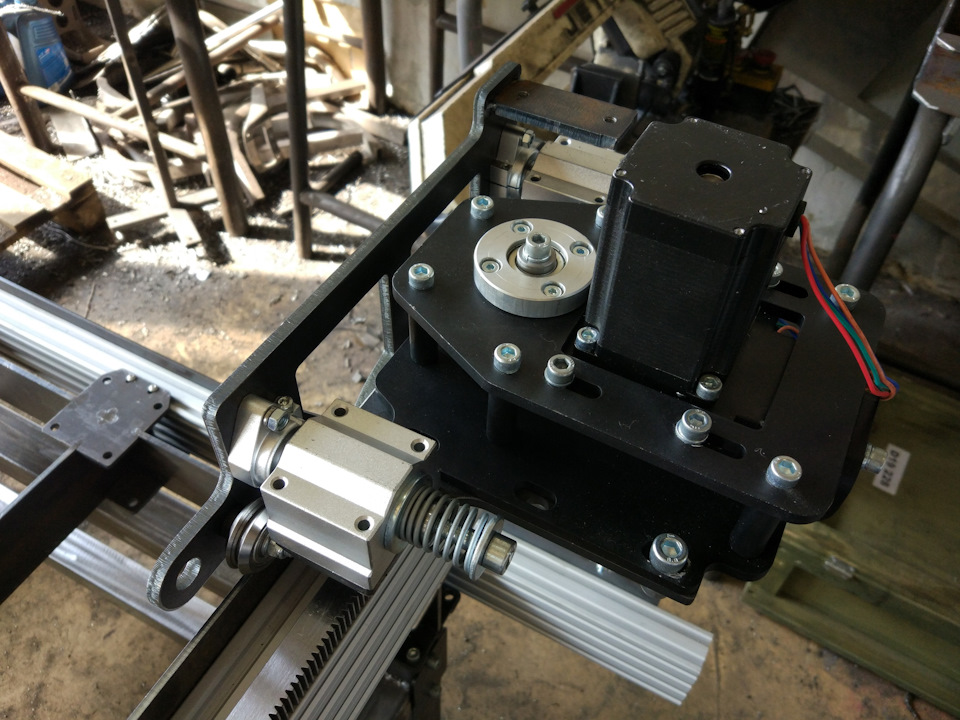 Из-за ограничений бюджета в данном станке используются редукторы с ременной передачей. Они гораздо массивнее и тяжелее, чем планетарные, но свою функцию выполняют. В связи с выросшей массой портала мы увеличили напряжение питания двигателей, чтобы обеспечить требуемую динамику. Систему подвески редукторов в связи с этим также пришлось переработать.