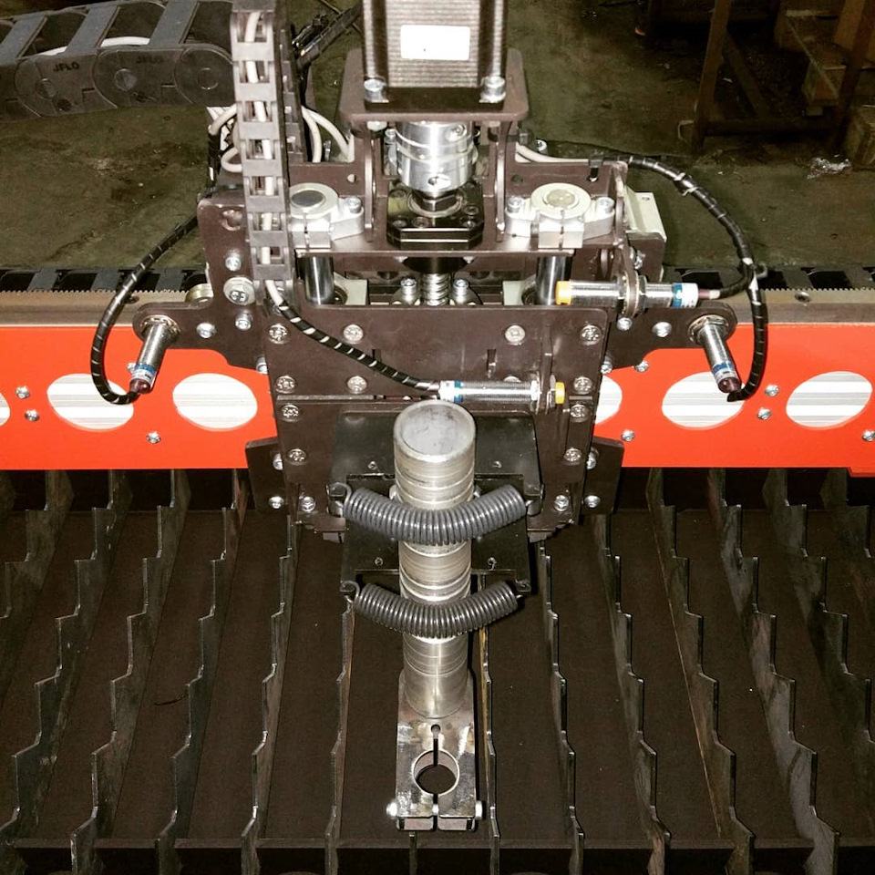 Предоставленный нам аппарат плазменной резки был оснащен ручной горелкой, поэтому для ее установки потребовалось изготовить отдельный держатель. Кабель у ручной горелки оказался слишком коротким, поэтому был изготовлен специальный поворотный кронштейн для его подвески над рабочим столом.