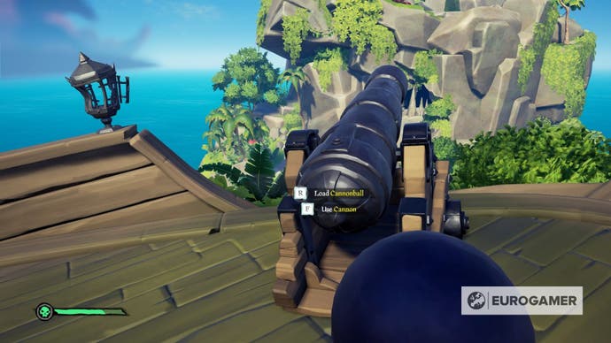 Take these cannonballs and then head up the stairs to the top floor of this part of the ship. Here you’ll find a cannon and all you have to do now is load, then fire, the cannon.