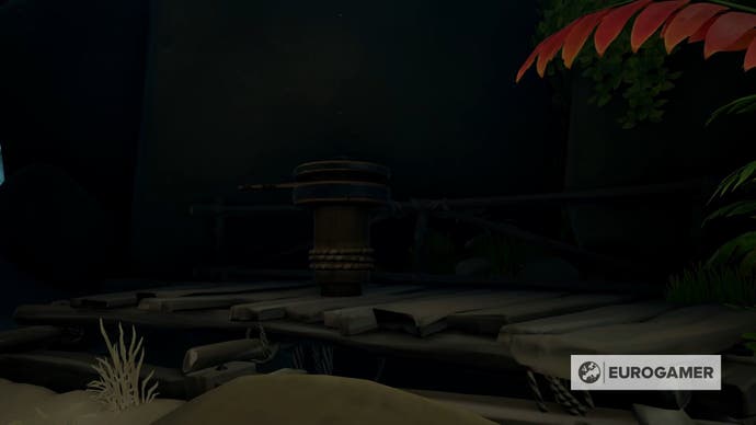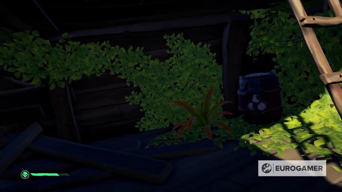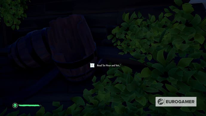 Once you reach the other side of the boat, look to your left and you’ll see a pair of barrels surrounded by leaves. At the foot of the upright barrel you’ll find ‘So Near and Yet…’