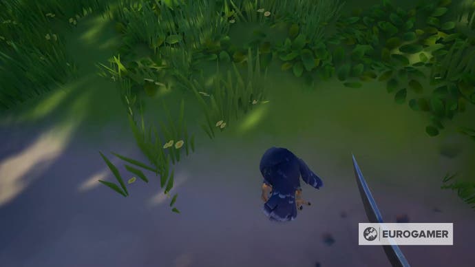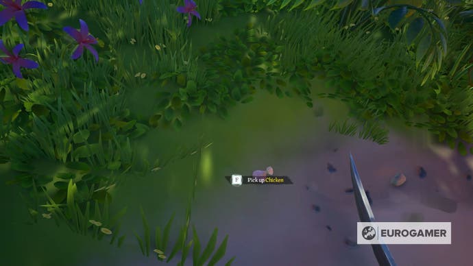 Once you’ve committed chickenide, pick up the chicken meat left behind and take it to the nearby campfire.