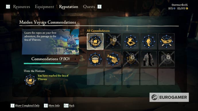 From there select Tall Tales and then cycling to the next screen, where you’ll find the option for Maiden Voyage. Here you’ll find a full list of commendations available for this quest and the rewards you’ll receive for completing them.