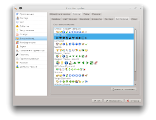 Открываем Меню-Настройки и переходим на вкладку Внешний вид. В окне настройки выбираем шрифт, иконки, смайлы для ростера, статусы и т.д.