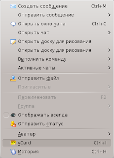 В Jabber существует визитная карточка vCard у каждого аккаунта. Вы можете ее заполнить и указать информацию о себе. В будущем вас смогут найти знакомые и друзья через специальный транспорт JUD и добавить в свой ростер. Щелкаем правой кнопкой мыши на вашем аккаунте и выбираем vCard.