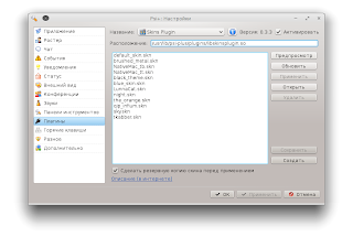 Можно выбрать скин для клиента. Для этого переходим на вкладку Плагины, в поле Название выбираем Skins Plugin и ставим флажок Активировать.