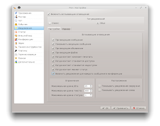 Сделаем уведомления интегрированными с KDE. Переходим на вкладку Уведомления и ставим флажок на Включить всплывающие сообщения и DBus.