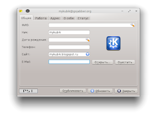 На этом регистрация закончилась и можно смело выходить в сеть под свои новым Жаббер-аккаунтом. Сразу после соединения с сервером — вводим нужные личные данные. (Имя, блог, мыло etc)