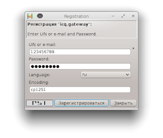 Вводим номер ICQ, пароль, выбираем кодировку cp1251 и нажимаем Зарегистрироваться.