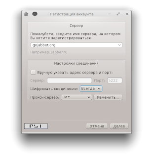 Перед первый запуском Psi, вам придется создать аккаунт. В окне Register Account, в поле Server можно выбрать из выпадающего списка Jabber-сервер или ввести самому, например jabbus.org или jabber.ru. (адреса jabber-серверов могут быть и другие — Гугл/Яндекс Вам в помощь)