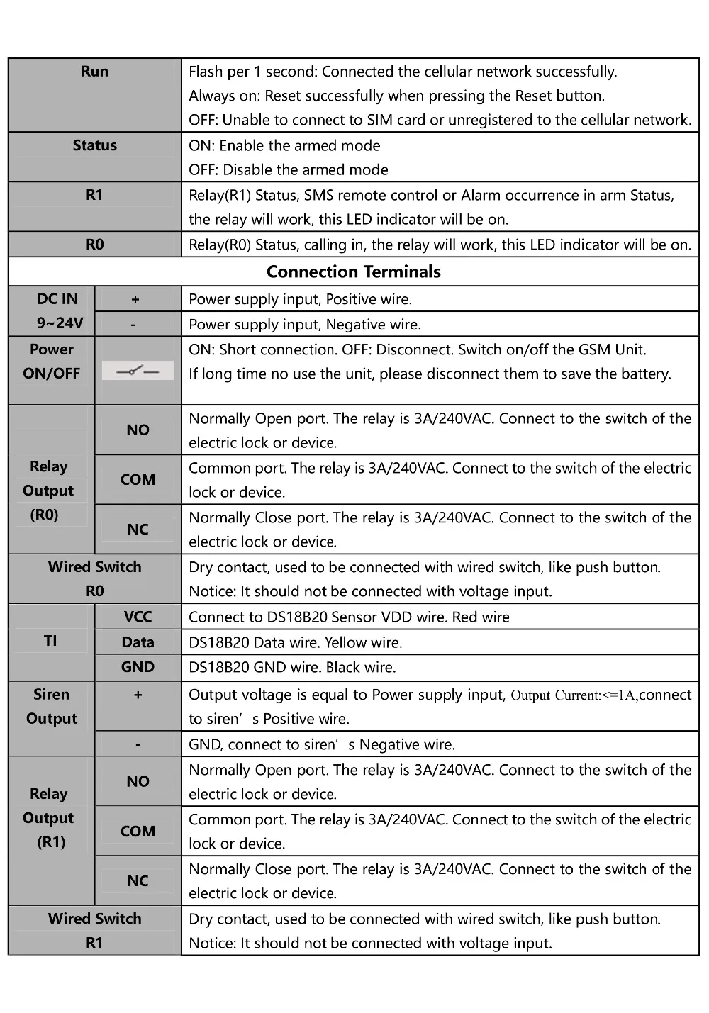 * Внешний мониторинг состояния питания переменного/постоянного тока, включение/выключение питания переменного/постоянного тока отправит SMS и немедленно вызовет 6 предустановленных мобильных телефонов.