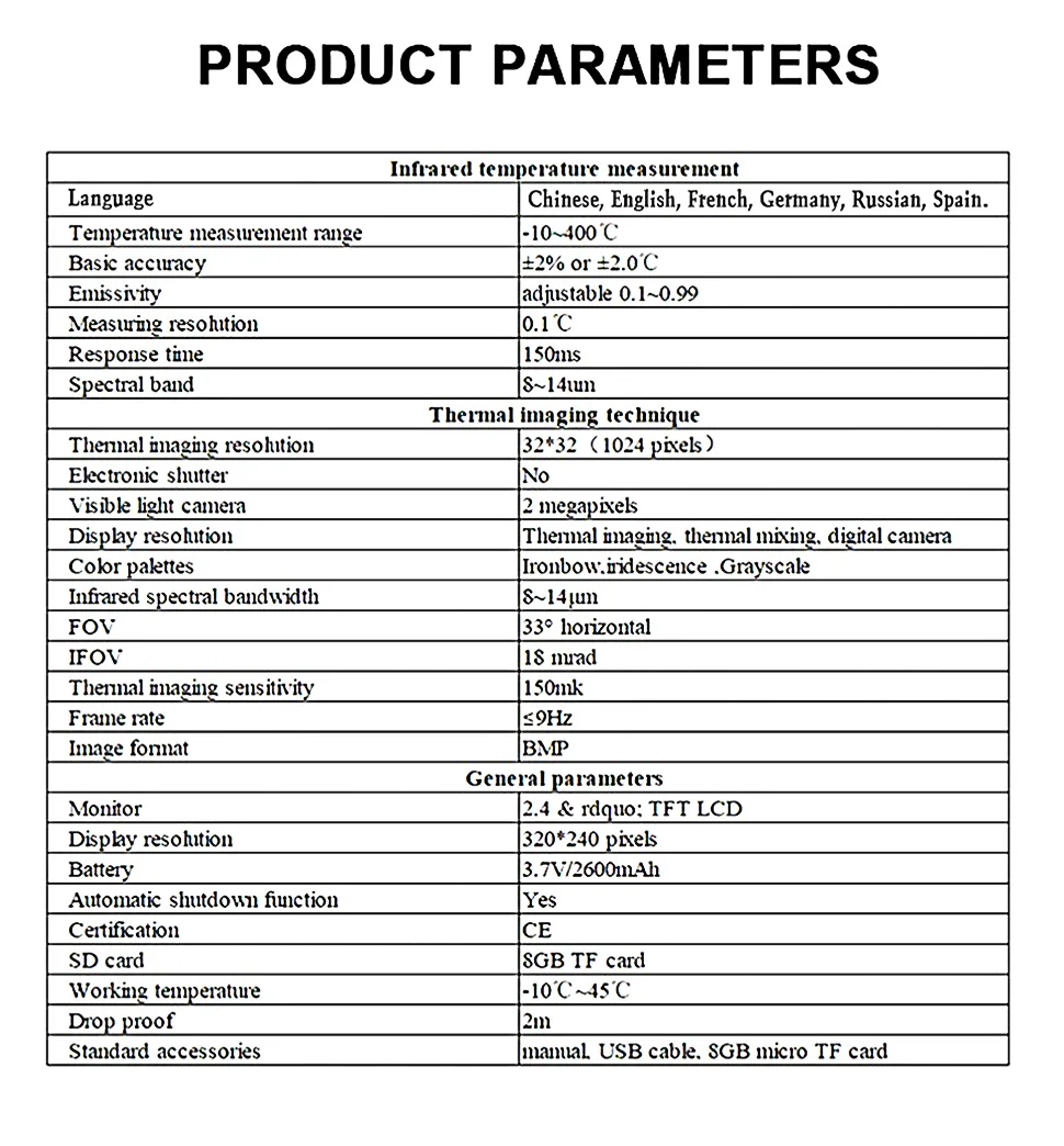 | Комплектация | Тепловизор – 1 шт., кабель USB – 1 шт., блок питания – 1 шт., micro SD карта на 8 гб – 1 шт. |