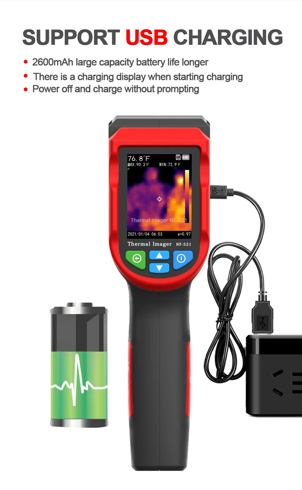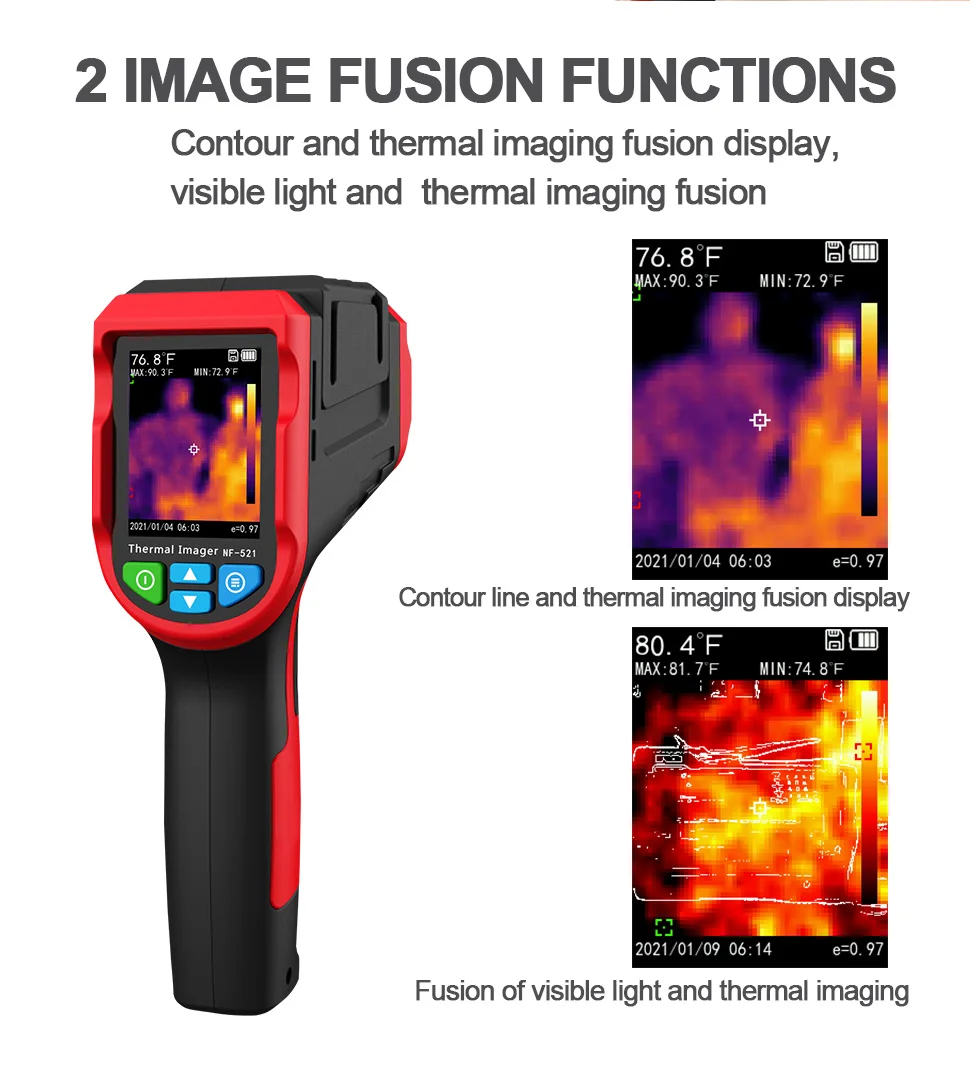 Портативный инфракрасный тепловизионный прибор NF-521 S представляет собой высокоточное портативное тепловизионное устройство. Метод отображения инфракрасного тепловидения и видимого света можно использовать для захвата изображения температуры целевого объекта каждого пикселя, а за счет объединения видимого света состояние объекта можно сфотографировать более четко.