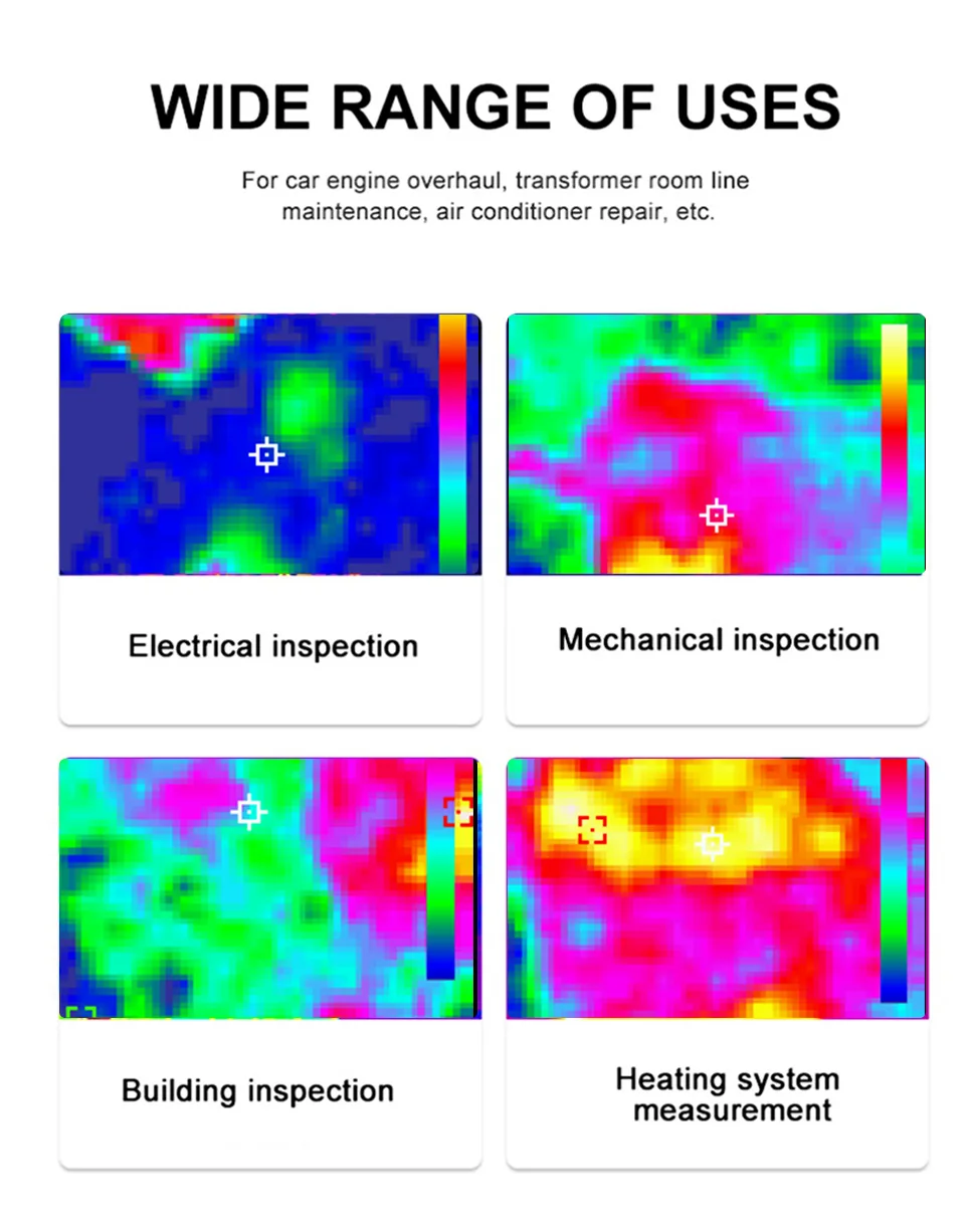 - Высокоточное измерение температуры: проводит точные замеры в диапазоне -10~400 °C. Это помогает оперативно выявлять тепловые аномалии и проблемы, добиваясь эффективного ремонта и обслуживания систем.