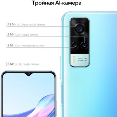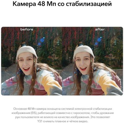Используя любой из трех объективов, установленных на Vivo Y31, вы получите яркие кадры – эти датчики рассчитаны на использование в различных сценариях съемки. У основной камеры апертура f/1.79 и разрешение 48 МП, поэтому с ее помощью можно делать качественные фотографии даже ночью. Подавить лишние шумы на снимках помогают алгоритмы искусственного интеллекта.